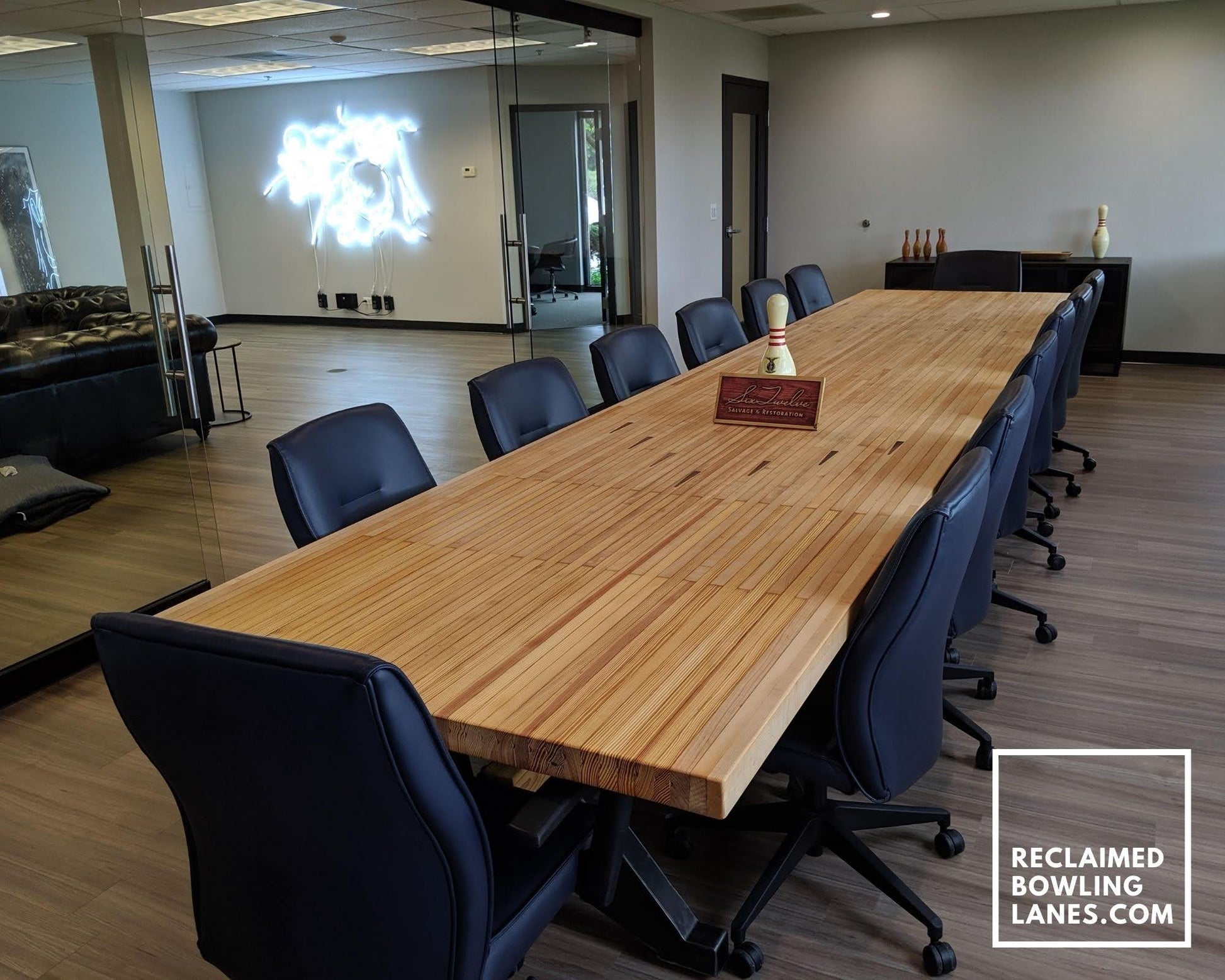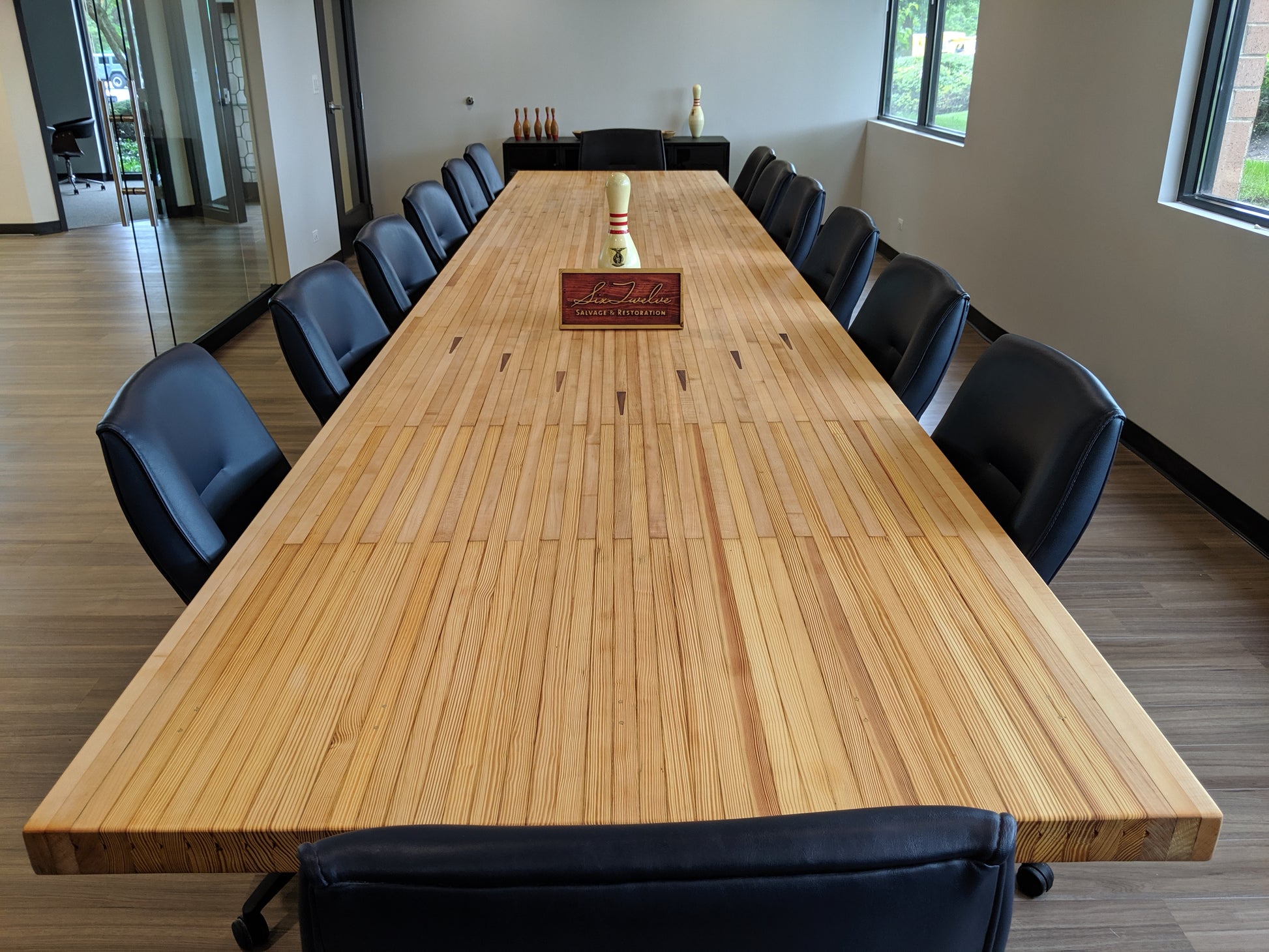 stunning 20ft x 4ft conference table featuring the most unique section of the bowling alley lane, complete with inlaid walnut arrows and the beautiful transition from maple to pine wood