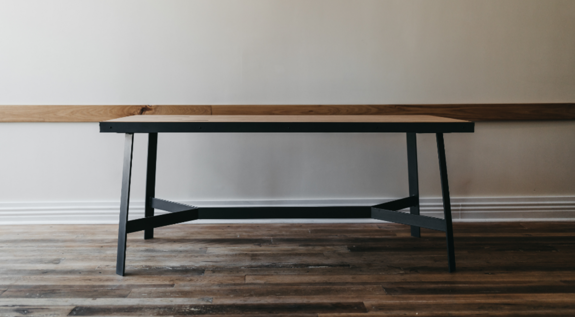 dining table made from vintage maple bowling alley wood with arrows
