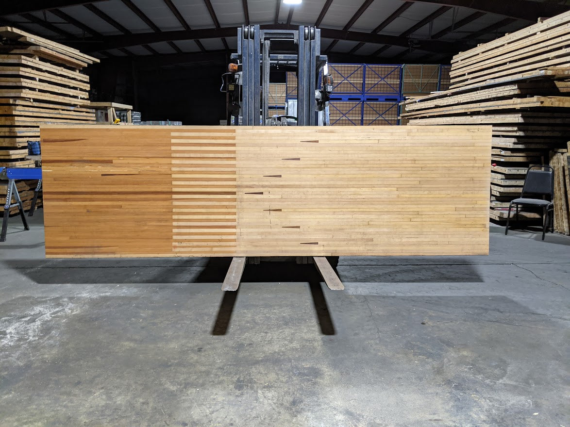 maple bowling alley slab with inlaid walnut arrows and species transition