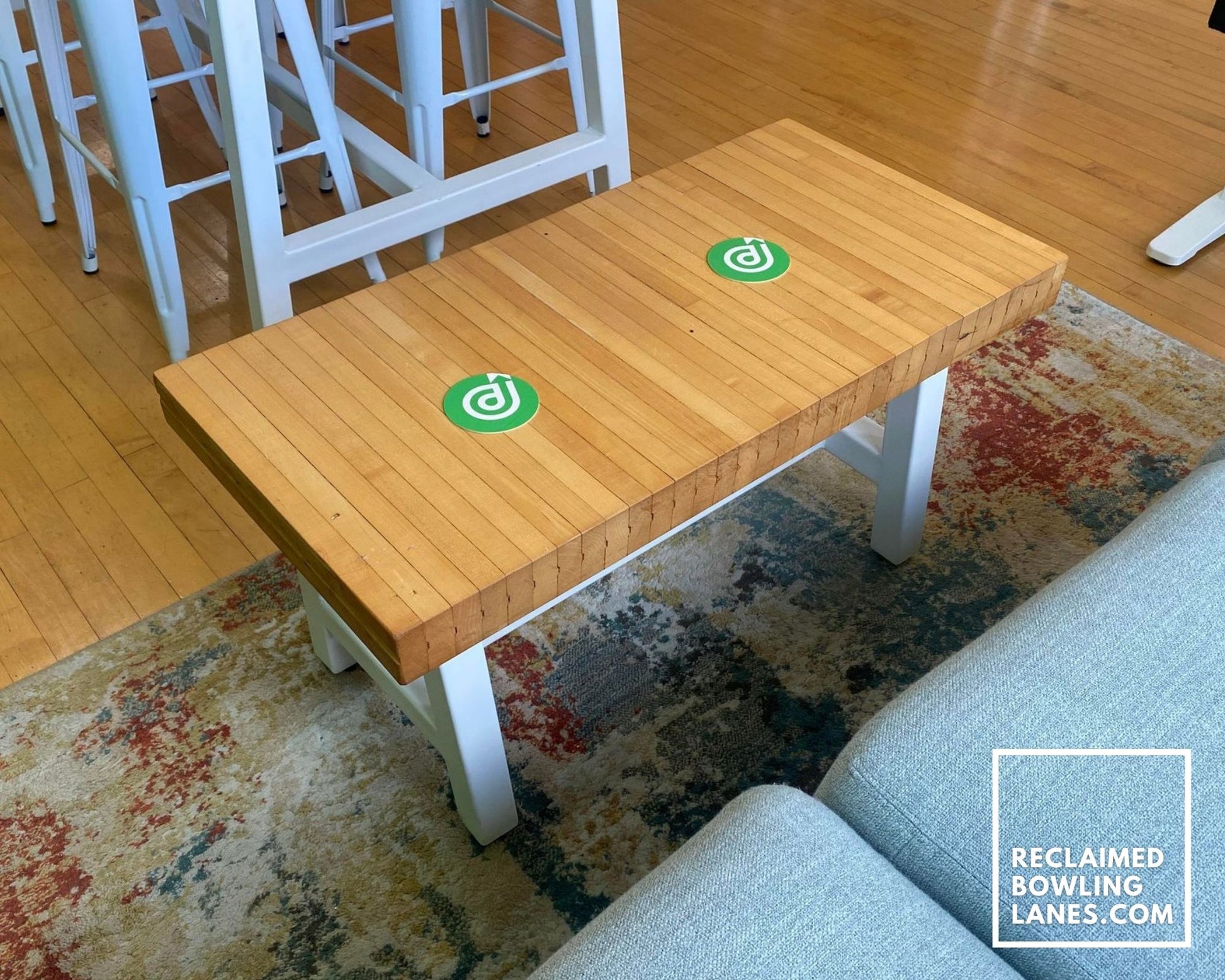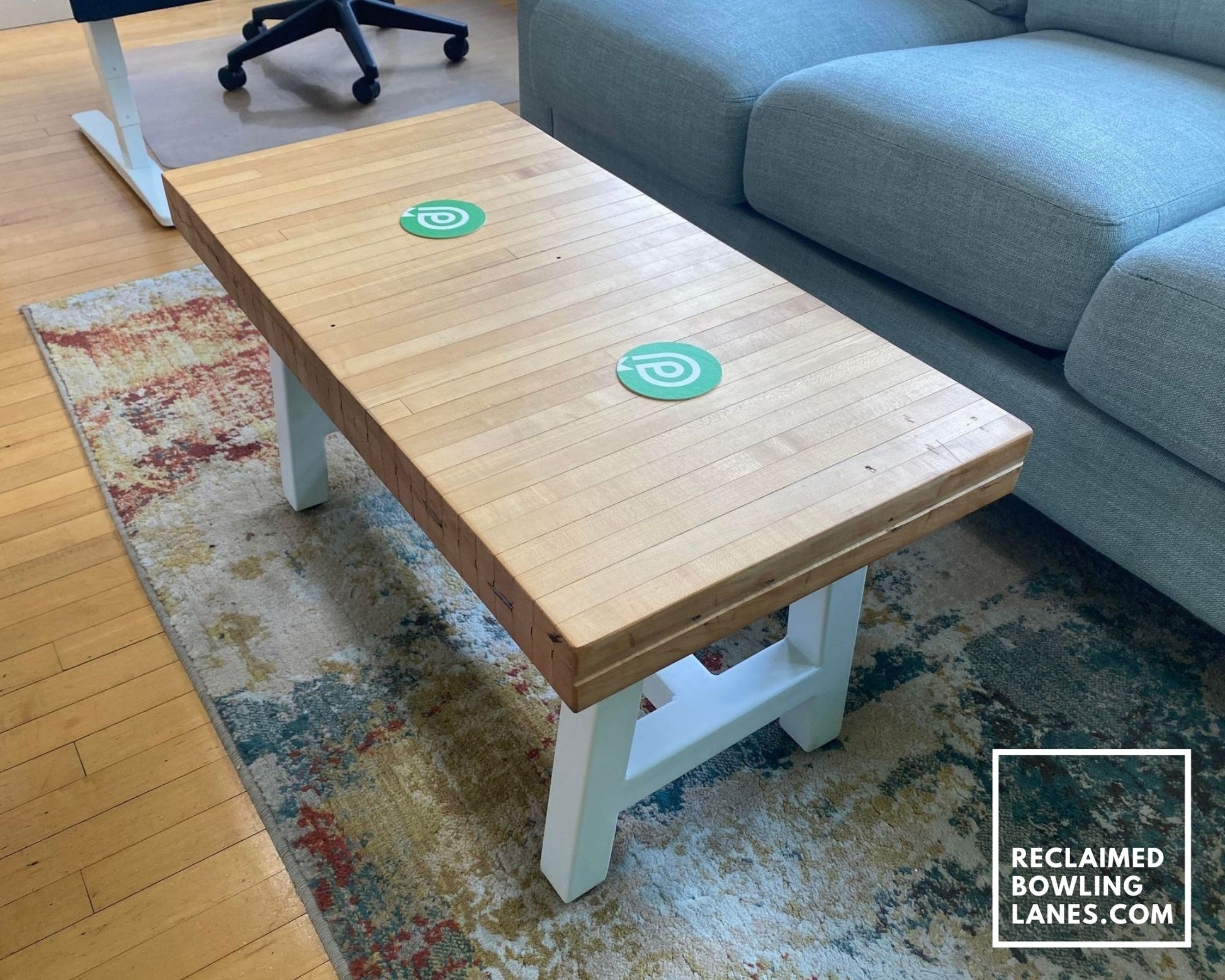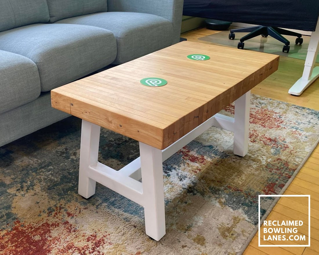Beautiful coffee table crafted from reclaimed bowling alley wood. Made from the maple section of the lane, this coffee table sits atop an industrial A-frame tube-steel base, powder coated white. Wood surface is sealed and protected with a hand rubbed oil finish, sustainably sourced and 100% VOC free. Approximately 36x18x18. Heavy duty levelers included. Inquire about custom sizes.